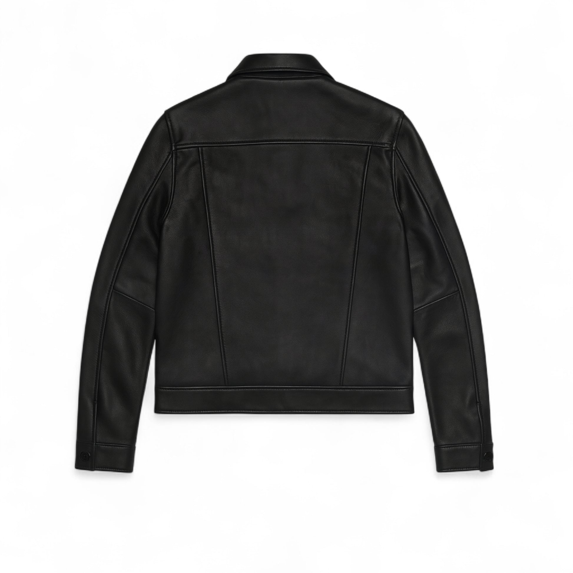 Una elegante chaqueta de cuero negra con un diseño clásico de mezclilla, completa con cierres de botón y bolsillos en el pecho, perfecta para añadir un toque de sofisticación atrevida a cualquier atuendo.