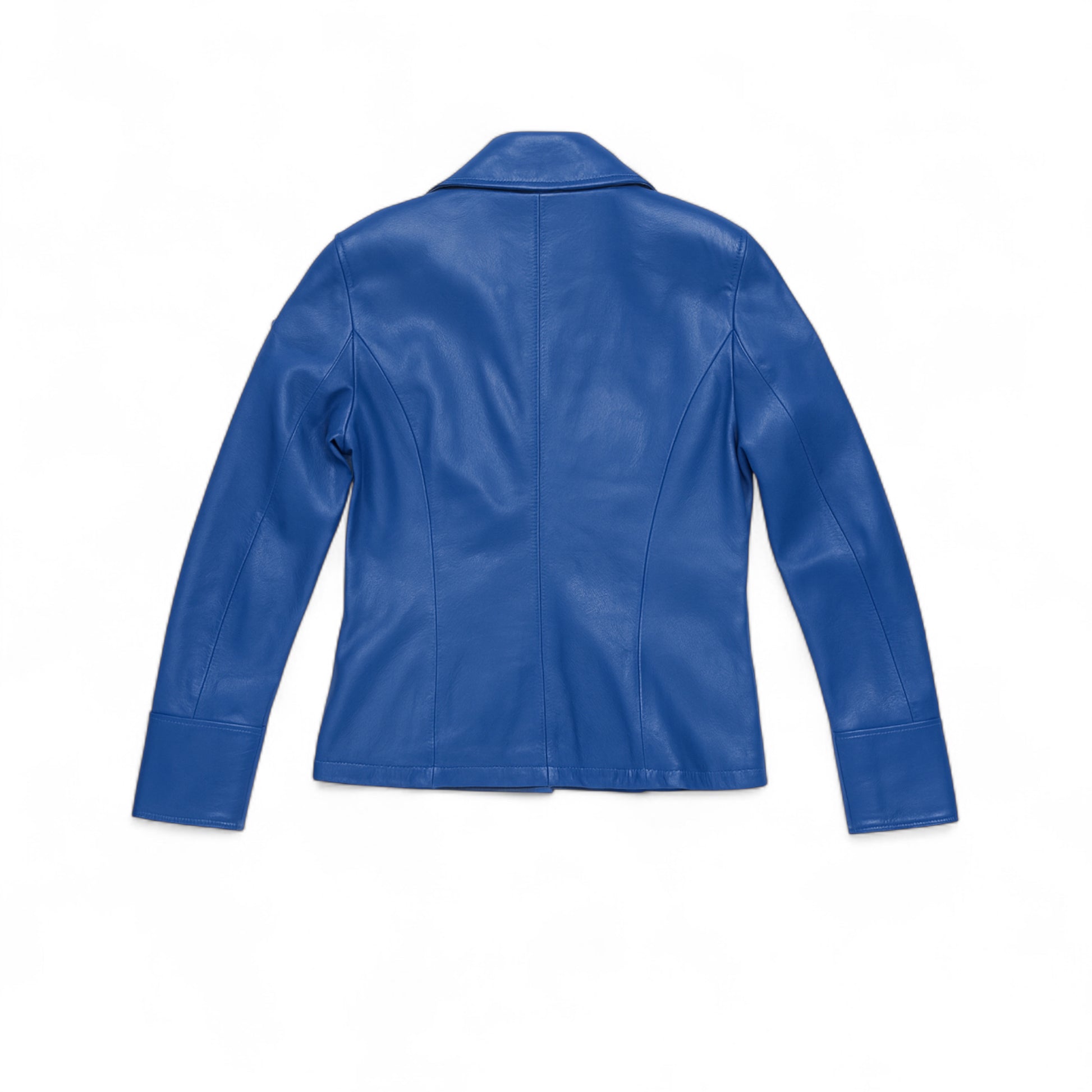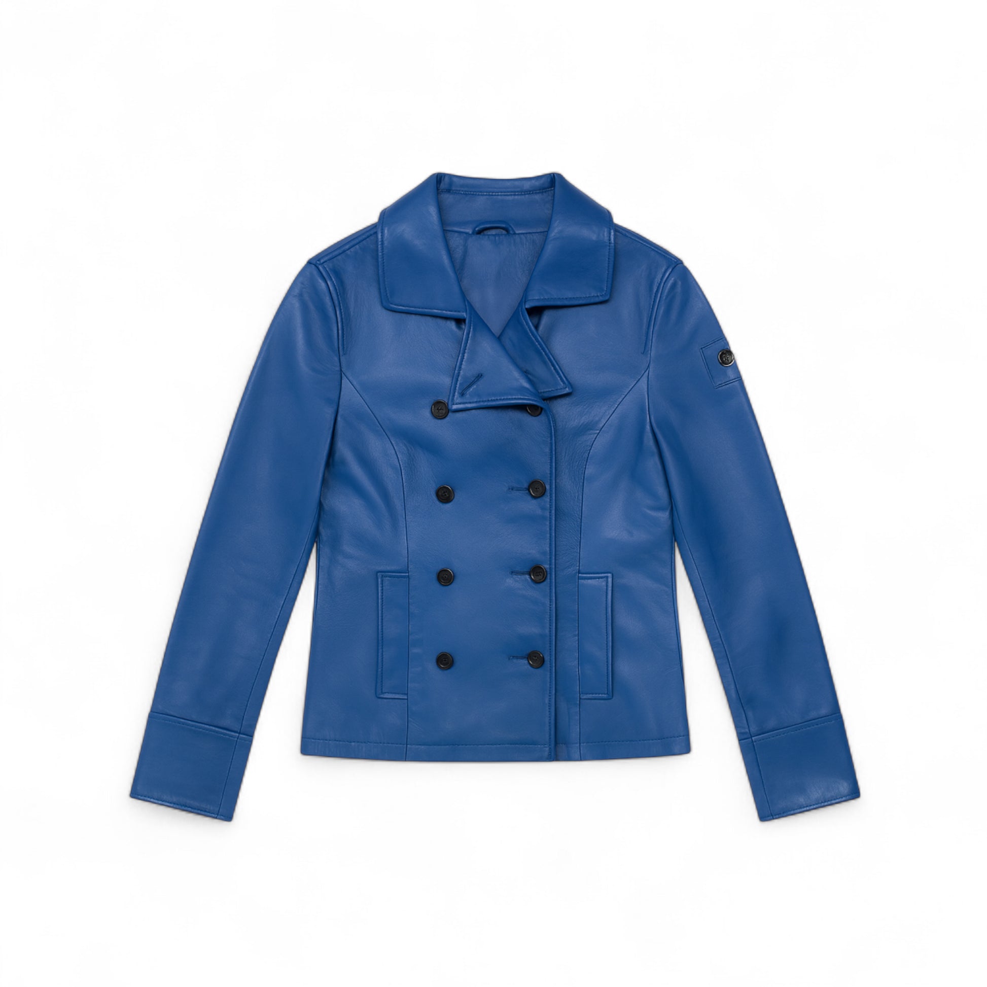 Un caban en cuir bleu élégant avec un design croisé et des revers classiques, parfait pour ajouter une touche audacieuse à toute tenue.