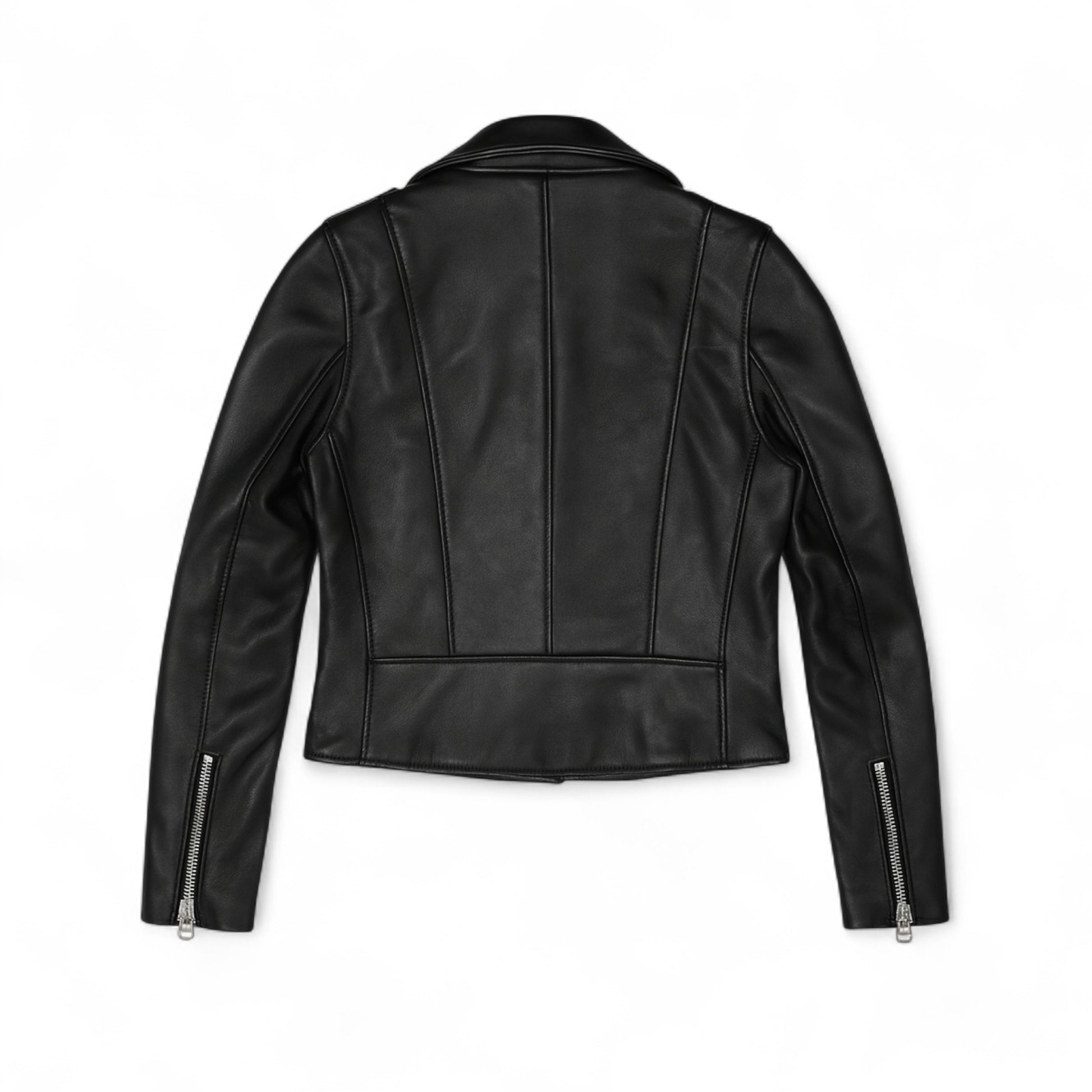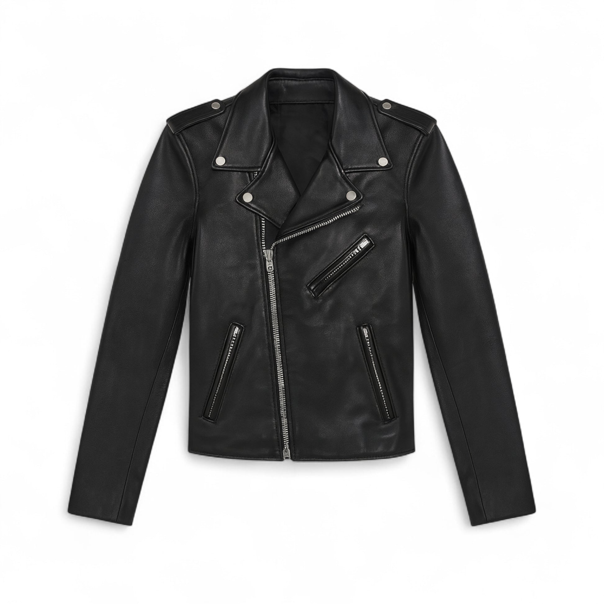 Une veste de motard en cuir noir classique avec une fermeture éclair asymétrique élégante, plusieurs poches zippées et des épaulettes, parfaite pour ajouter une touche audacieuse à n'importe quelle tenue.