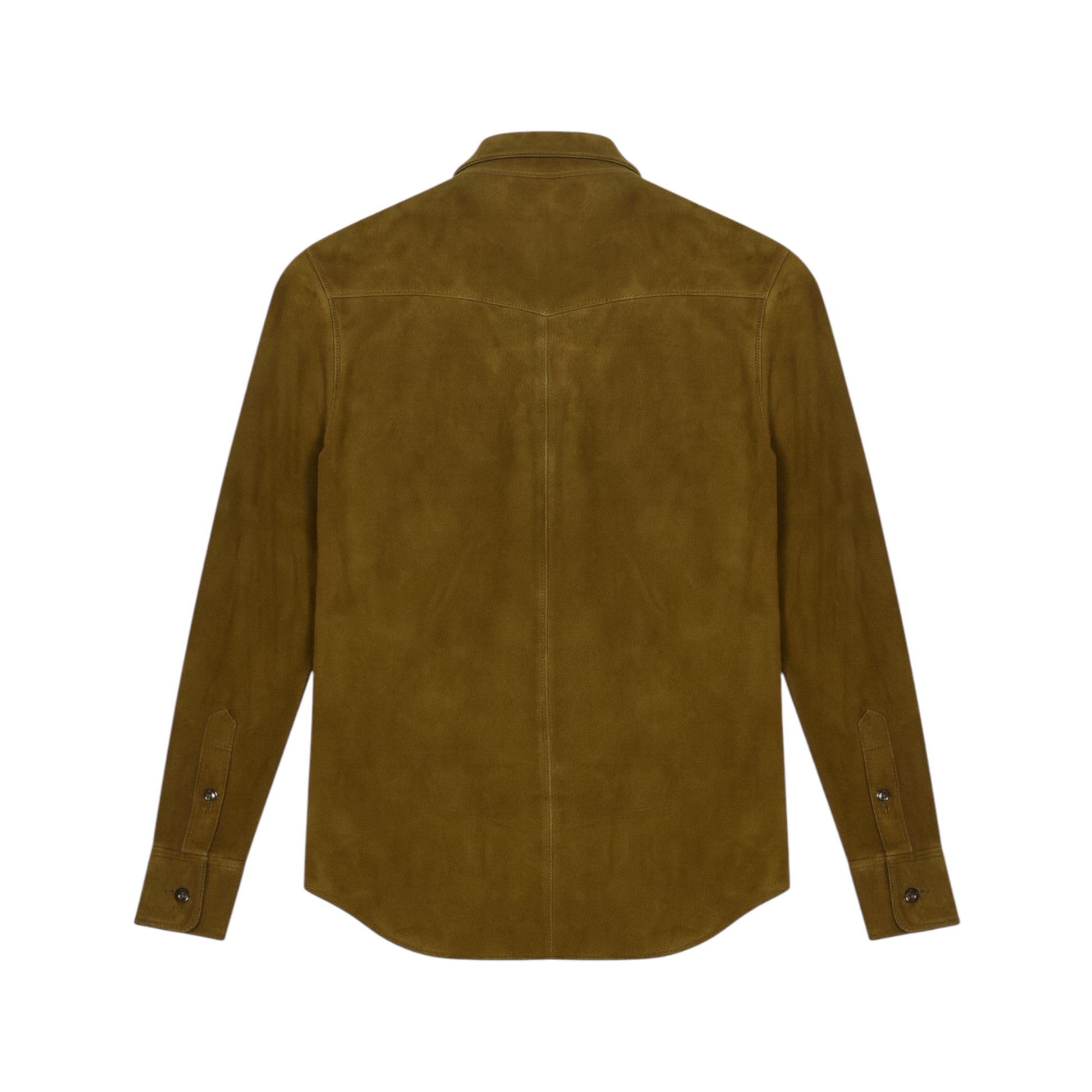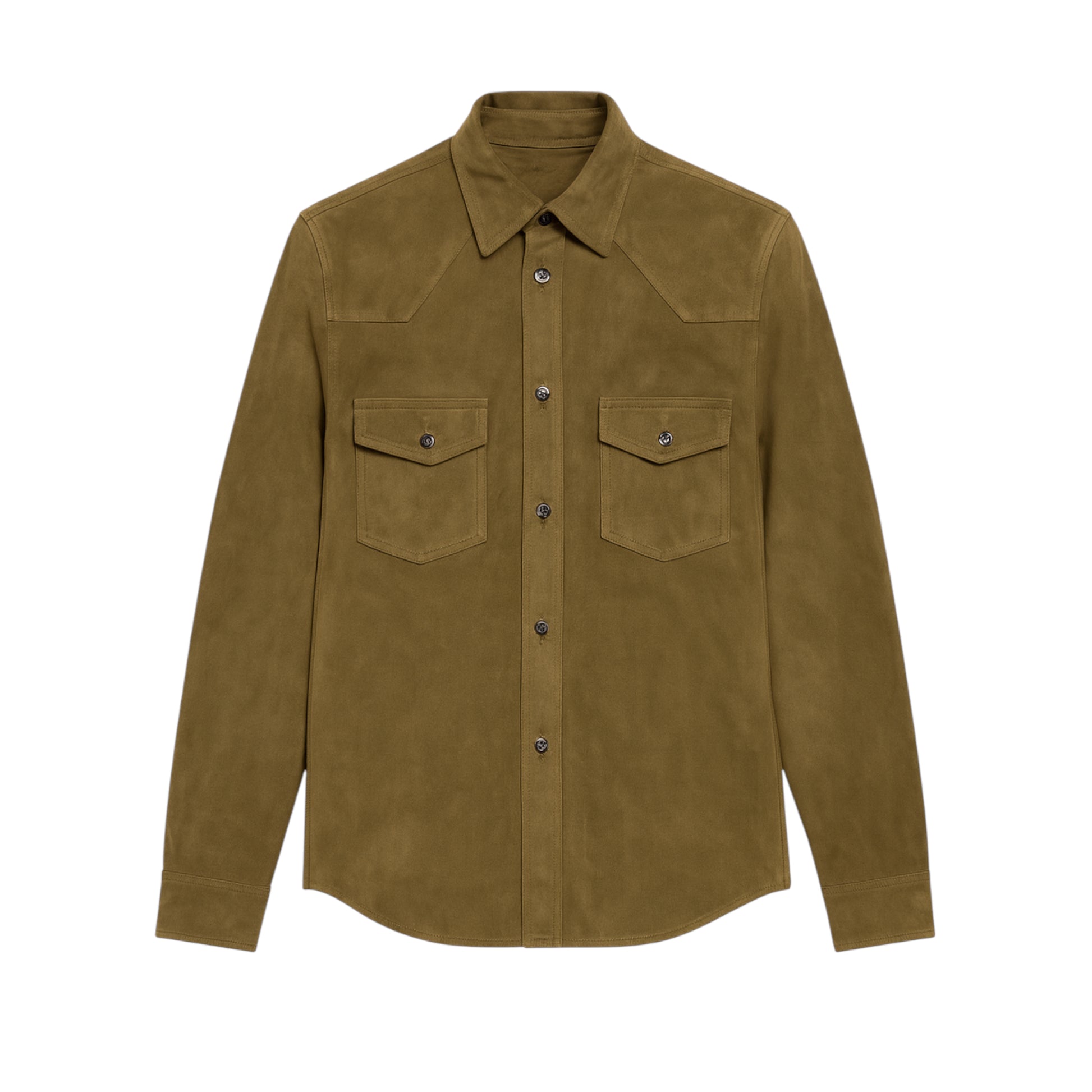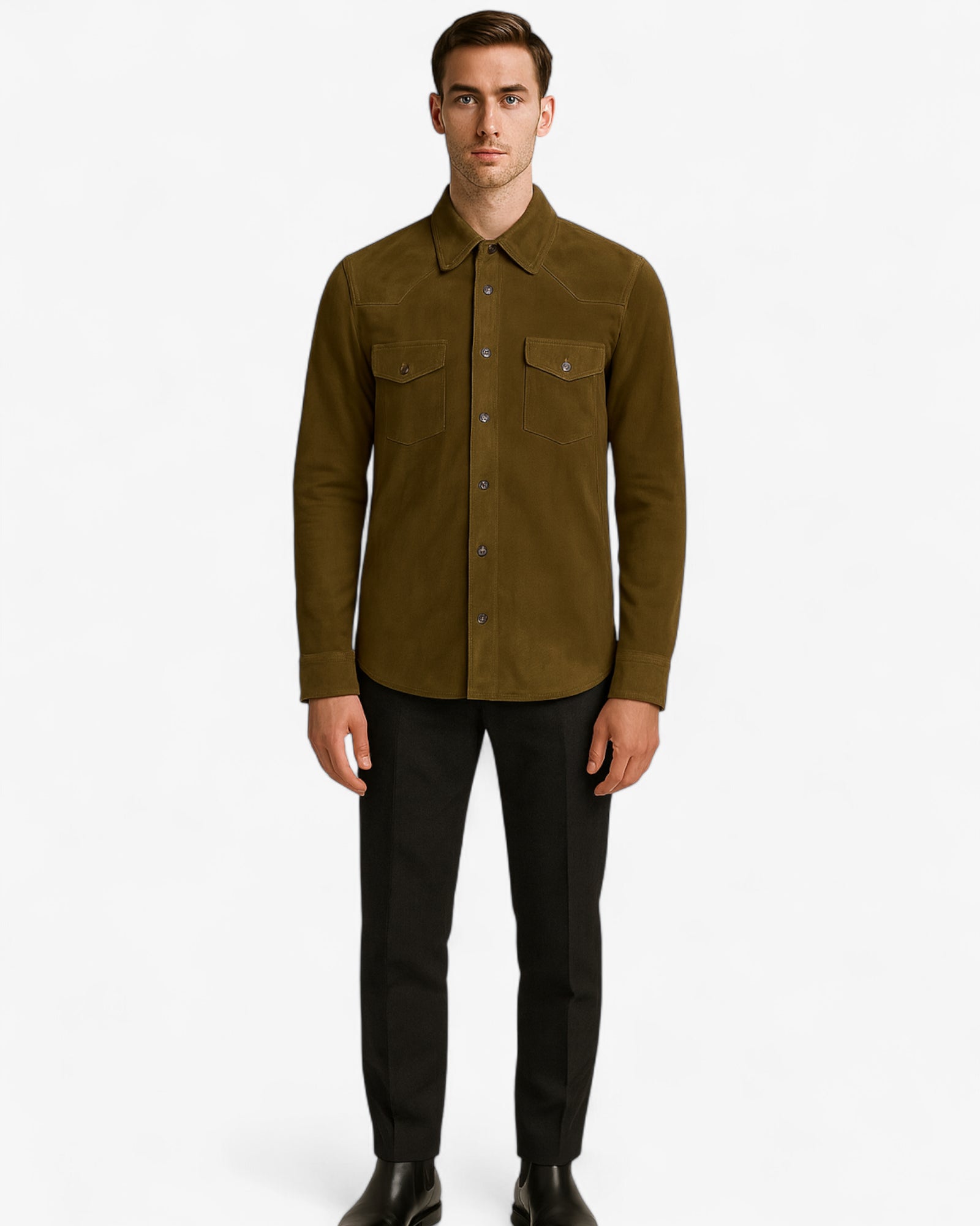 Una elegante camicia in camoscio verde oliva con un classico design western, completa di due tasche sul petto e bottoni a pressione, perfetta per un look sofisticato ma casual.