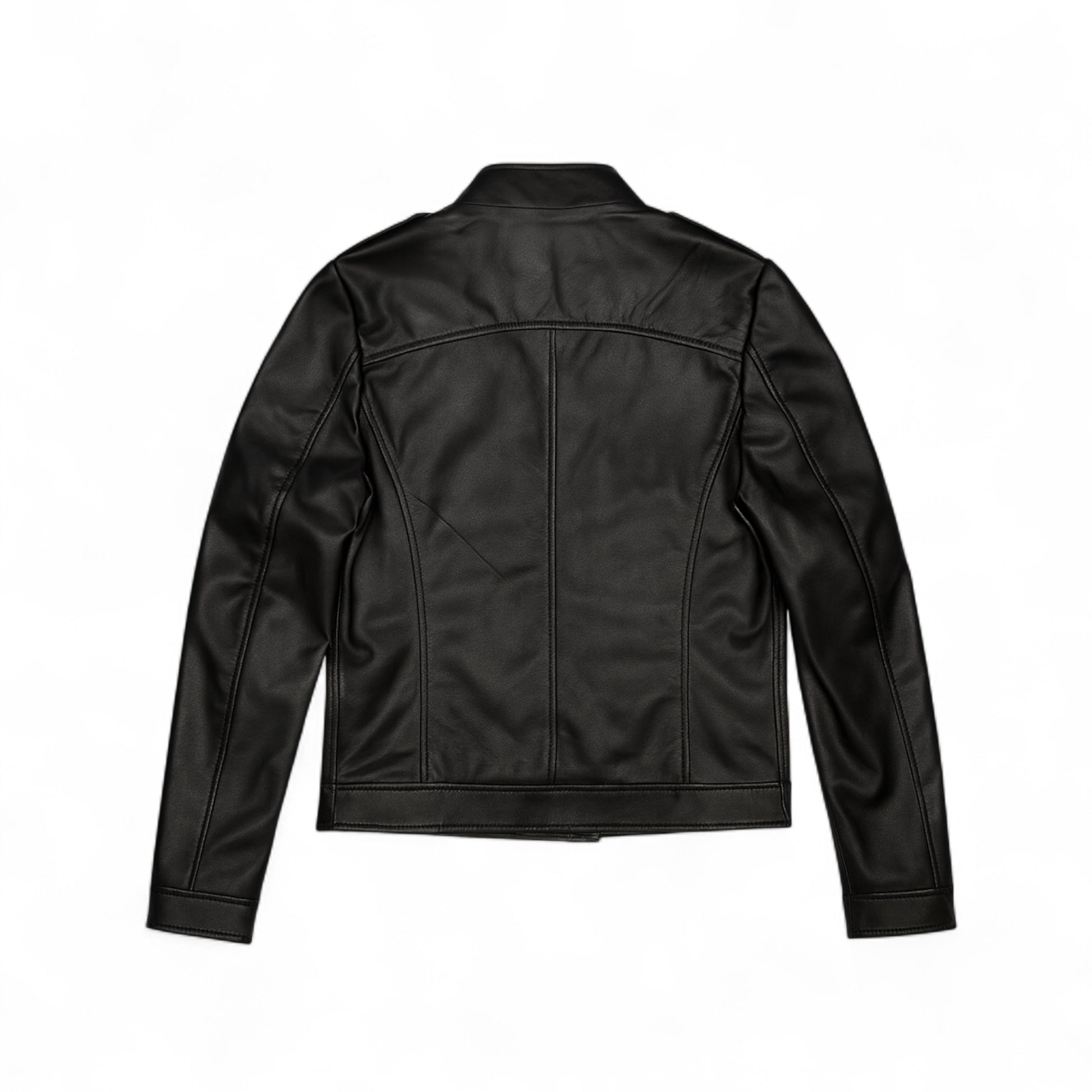 Una giacca in pelle nera elegante con un design unico ispirato allo stile militare, completa di bottoni decorativi e una silhouette strutturata, perfetta per aggiungere un tocco audace a qualsiasi outfit.