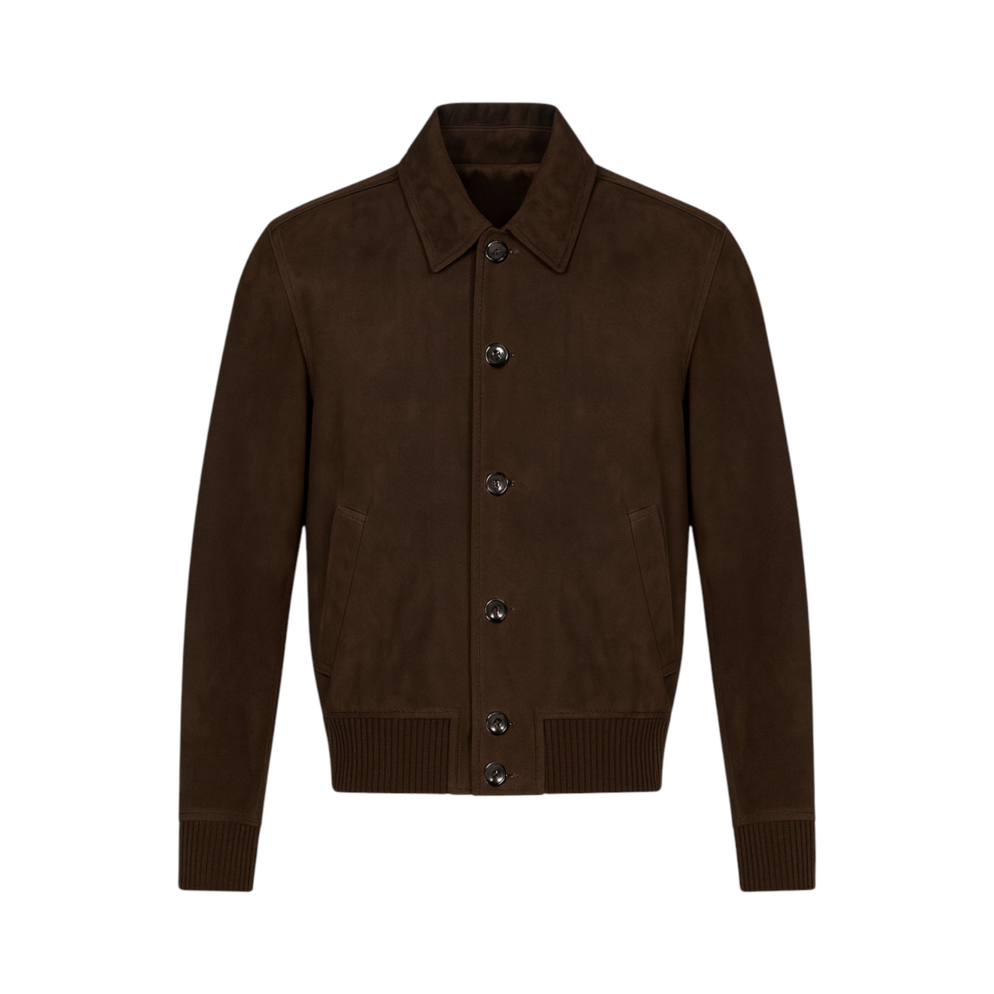 A stylish brown suede jacket featuring a classic button-up front, ribbed cuffs, and a sleek collar, perfect for adding a touch of sophistication to any outfit.